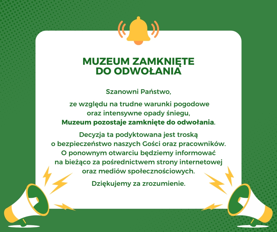 Ze względu na wyjątkowo trudne warunki pogodowe oraz intensywne opady śniegu, Muzeum pozostaje zamknięte do odwołania.